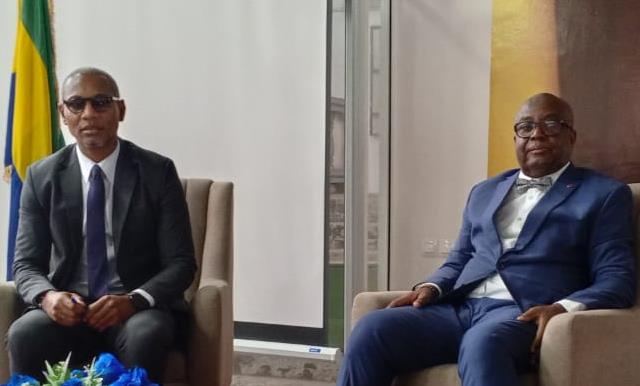 Le ministre des Sports, Paul Ulrich Kessany (à gauche) et son collègue de l’Intérieur, Adrien Nguema Mba, lors de la communication avec les journalistes.
