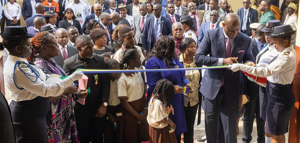 Le Président de la République, Chef de l’Etat, Chef du gouvernement, Brice Clotaire Oligui Nguema, procédant à la coupure du ruban symbolique, en présence de la ministre de l’Education nationale.