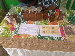 Mateo nous parle de la saveur du Nkom, une boisson alcoolisée du terroir : « Je vous présente le vin qu’on appelle en fang Nkom. Qui veut dire guerrier, qui veut dire vaillant. Ce vin est fait à base de bolokoum. Bolokm est un vin fait à base du maïs qu’on retrouve le plus souvent au nord, plus précisément à Oyem, Bitam, Mitzic. C’est fait à base d’un Elixir authentique, symbole de force et de convivialité issu d’un savoir-faire ancestral de la région du nord du Gabon. »