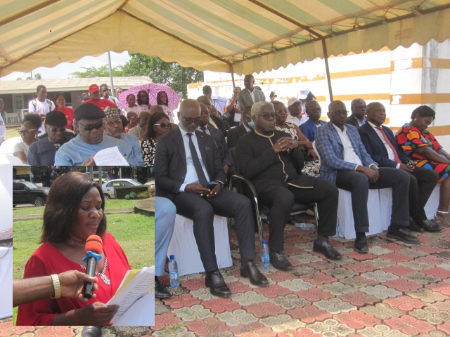 Le gouverneur Jules Djeki, entouré des responsables provinciaux de l’administration, écoutant les explications de Solange Ella Bengone, coordinatrice à Oyem du Programme national de lutte contre le SIDA (PNLS ), en médaillon.
