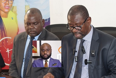 Deux des membres de l’organisation des médias, lors du point de presse animé par Désiré Ename (Echo du Nord), à droite, et Yves Laurent Ngoma (RFI), en médaillon notre confrère Harold Leckat de Gabon média time, toujours en détention.