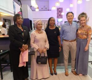 L’artiste Michelle Nze entourée de l’ambassadrice du Mali, de l’ancienne ministre Bike, de l’ambassadeur du Brésil et une accompagnatrice (à droite); quelques tableaux sur la deuxième image.