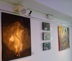 Une visite guidée a été l’occasion pour chacune des artistes de présenter ses œuvres au public: d’abord Michelle Nze (monuments, tableaux et autres objets exposés). Puis Mexhilus YMC et Ketsia. Des échanges ont pu être établis entre les artistes et les visiteurs.